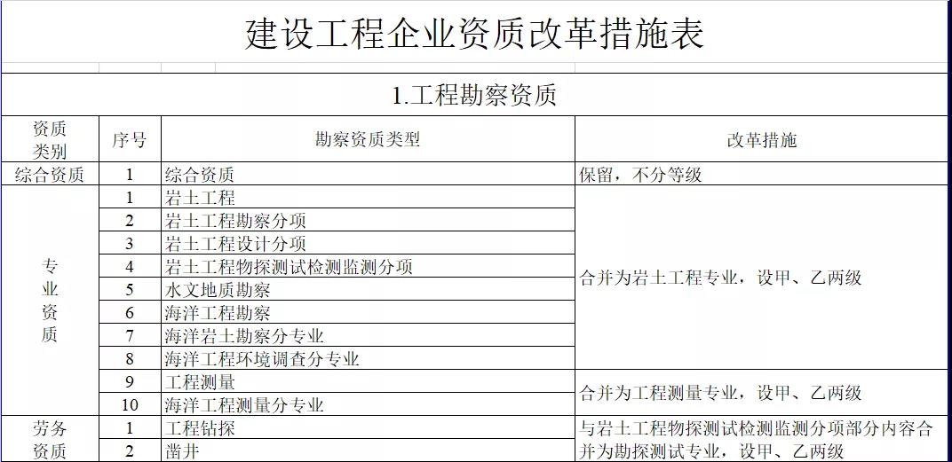 1.工程勘察資質。保留綜合資質;將4類專業資質及勞務資質整合為巖土工程、工程測量、勘探測試等3類專業資質。綜合資質不分等級,專業資質等級壓減為甲、乙兩級。