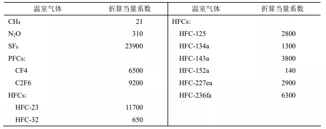 表2 典型非CO2溫室氣體的折算當量系數