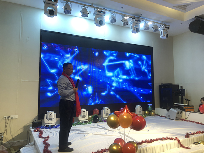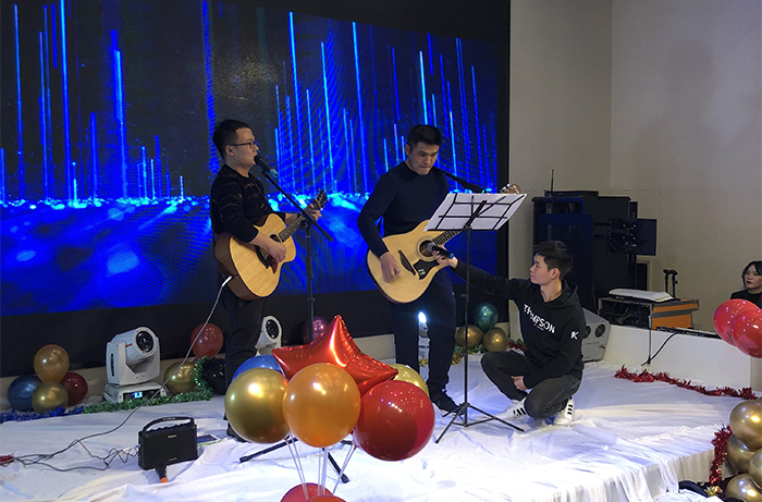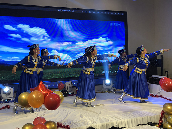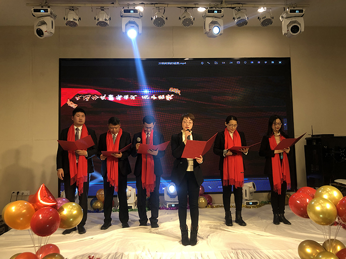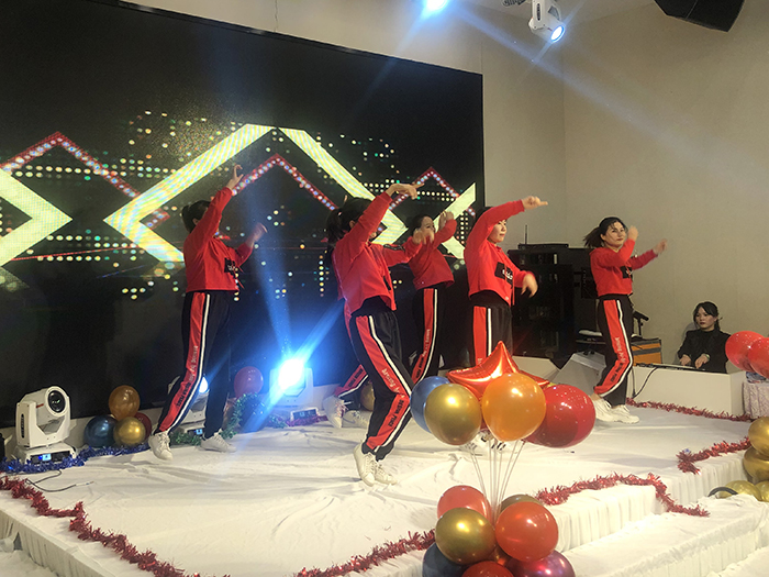 新年酒會和文藝節(jié)目同時進行,歡快的開場舞《護花使者》拉開晚會序幕,隨后,優(yōu)秀員工頒獎,歌曲、舞蹈、彈唱、游戲、抽獎等穿插進行。