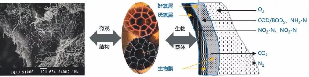 KtIC一體化污水處理設備,采用多級式MBBR & SBBR組合工藝,結(jié)合國內(nèi)外先進的高效溶氧裝置、高效流化傳質(zhì)系統(tǒng)與均質(zhì)布水系統(tǒng),通過培育附著在比表面積超過800 m2/m3的BIO-FORM®納米生物載體上的混合兼性菌種,構成BIO-NET生態(tài)系統(tǒng)。其以革蘭氏陽性芽孢桿菌(Bacillussubtilhls)為主、光合細菌 (Photosyntheticbacteria)、硝化、反硝化細菌等混合菌劑為輔的高效菌體,高效降解污/廢水中的總氮、 COD及氨氮等污染物,具有高效、耐沖擊、施工簡便、占地少等技術優(yōu)勢。